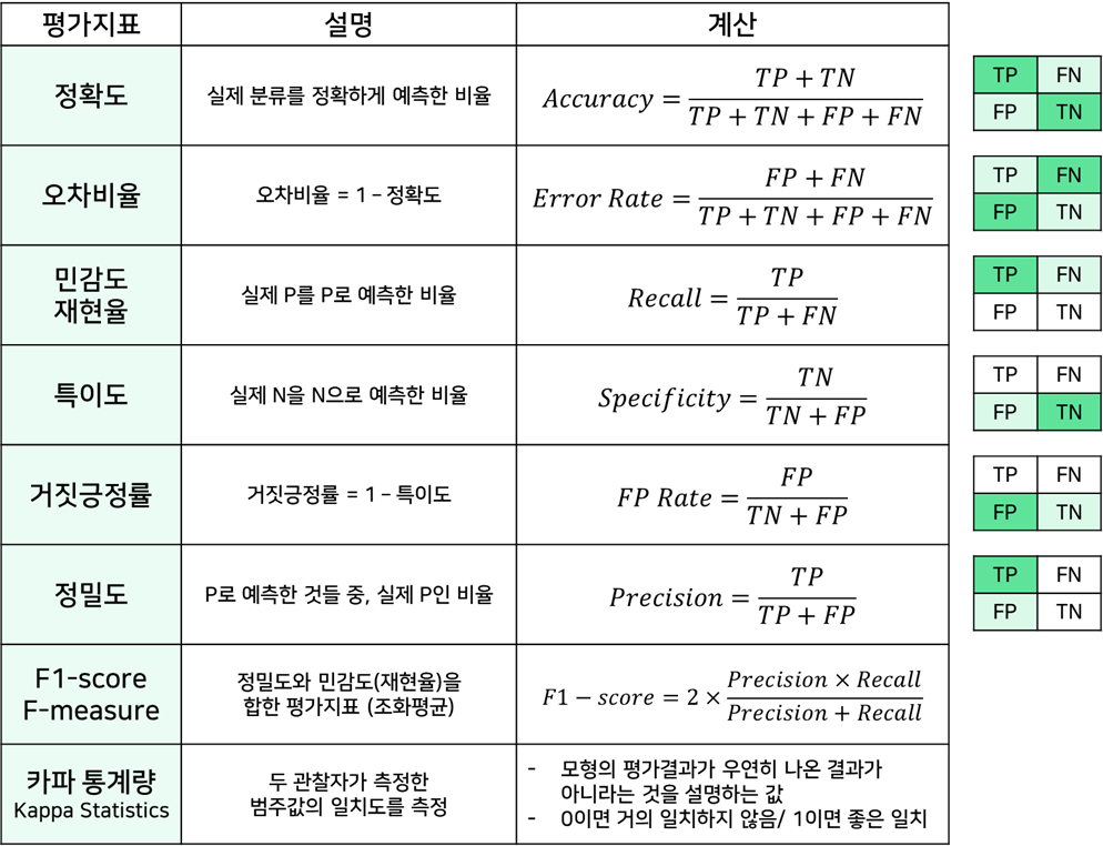 정확도/ 오차비율/ 민감도/ 특이도/ 거짓긍정률/ 정밀도/ F1-score/ 카파통계량