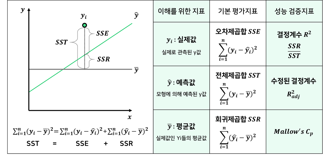 🔑 회귀 모형 평가지표/ SSE/ SST/ SSR/ R²=결정계수/ R²adj/ Mallow's Cp/