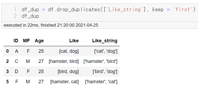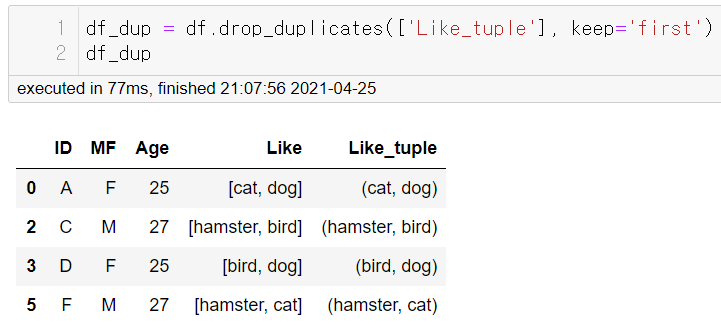 # Like_Tuple: Like 칼럼을 튜플로 변환한 칼럼 df['Like_Tuple'] = df.Like.apply(lambda x: tuple(x)) # Like_Tuple 칼럼을 기준으로 중복 제거 df.drop_duplicates(['Like_Tuple'], keep = 'first')